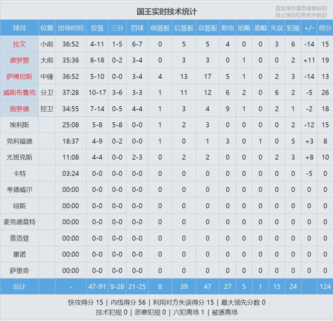 四節(jié)比分(國(guó)王在前):30-39、33-33、30-32、31-25。本賽季至今,威少在國(guó)王打了7場(chǎng),其中3場(chǎng)首發(fā)。場(chǎng)均出戰(zhàn)27.6分鐘,得到13.9分5.9籃板5助攻1.4搶斷2.4失誤,投籃命中率43.2%,三分命中率39.4%,罰球命中率70%。